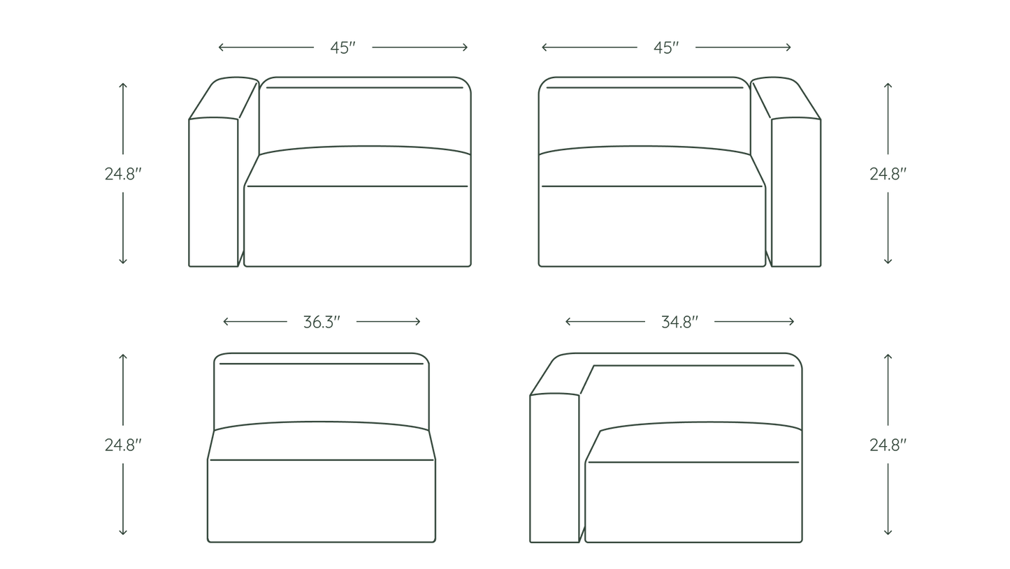 Left Module: 45" W x 34.5" D x 24.8" H | Right Module: 45" W x 34.5" D x 24.8" H | Center Module: 36.25" W x 34.5" D x 24.8" H | Corner Module: 34.75" W x 34.5" D x 24.8" H