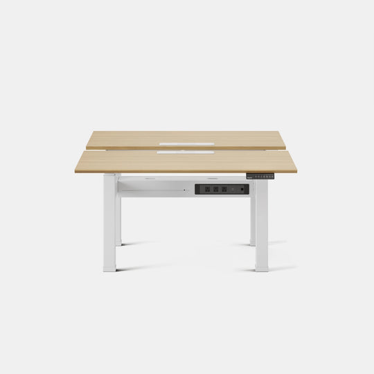 Timeless design is complemented by robust construction in the Double Standing Desk, featuring two separate tabletops on a fully-integrated base. With dual motors and three-stage lift columns, transitioning between sitting and standing is effortless, encouraging you and your team to stay active throughout the day. The desk also includes four memory presets at each tabletop, making it easy to set and save preferred heights for multiple teammates. Additionally, its central power console can be connected to other units, allowing them to be chained together for even more workspace.
